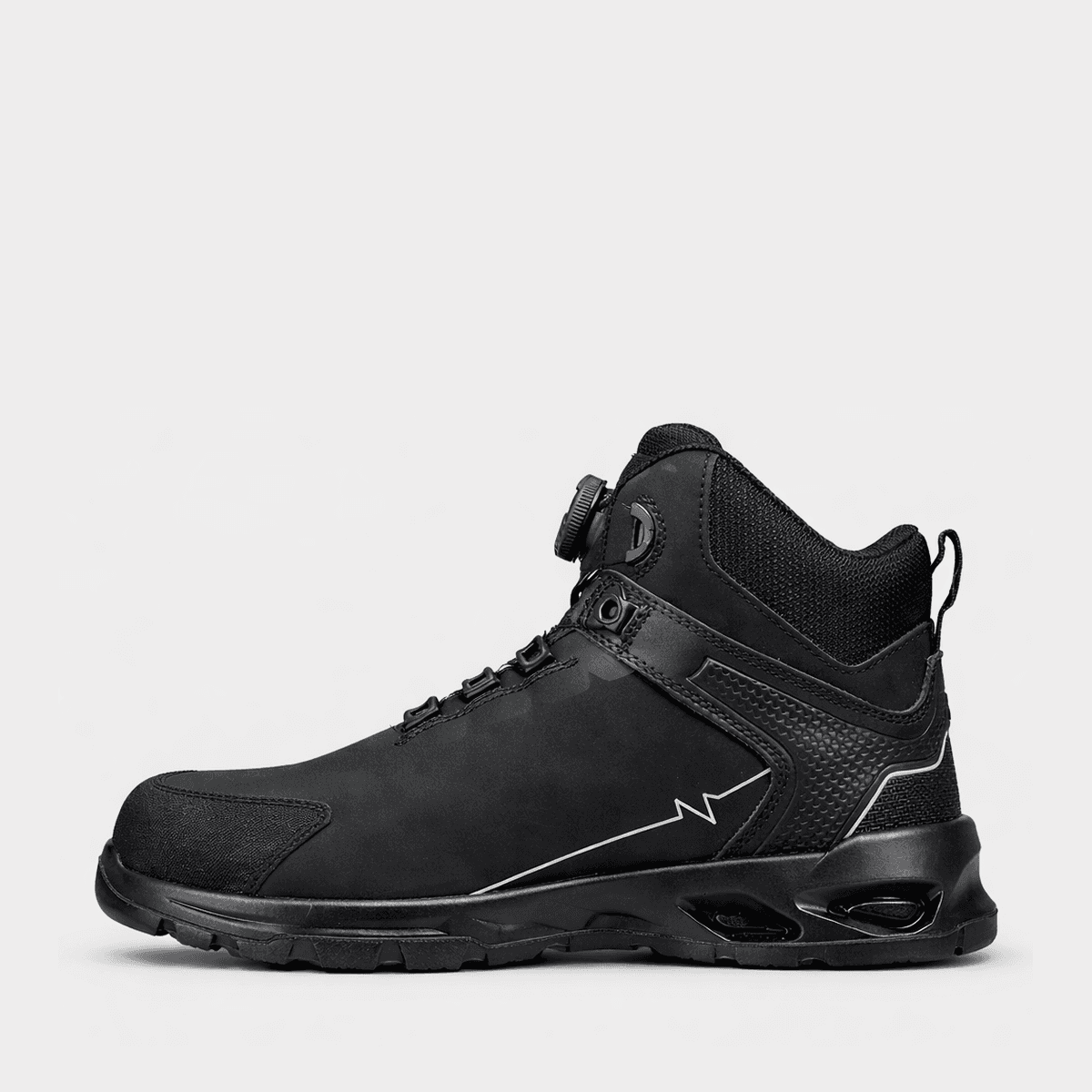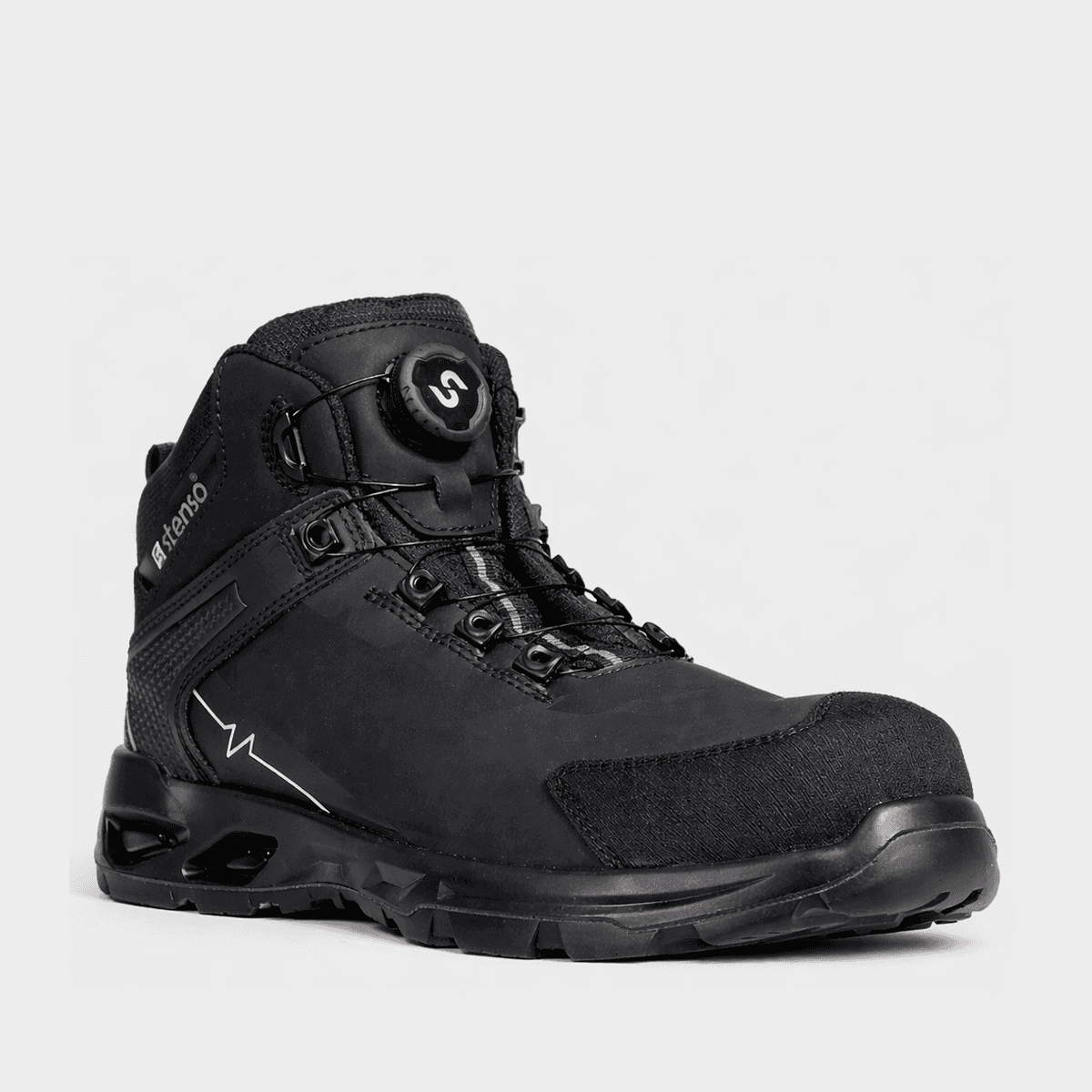 Modern Stenso safety boots designed for high performance and protection in demanding work environments. Ideal for professional use in construction, industry, and logistics. They feature a contemporary look, high safety level, and an automatic lacing system for easy on/off with a single twist.
