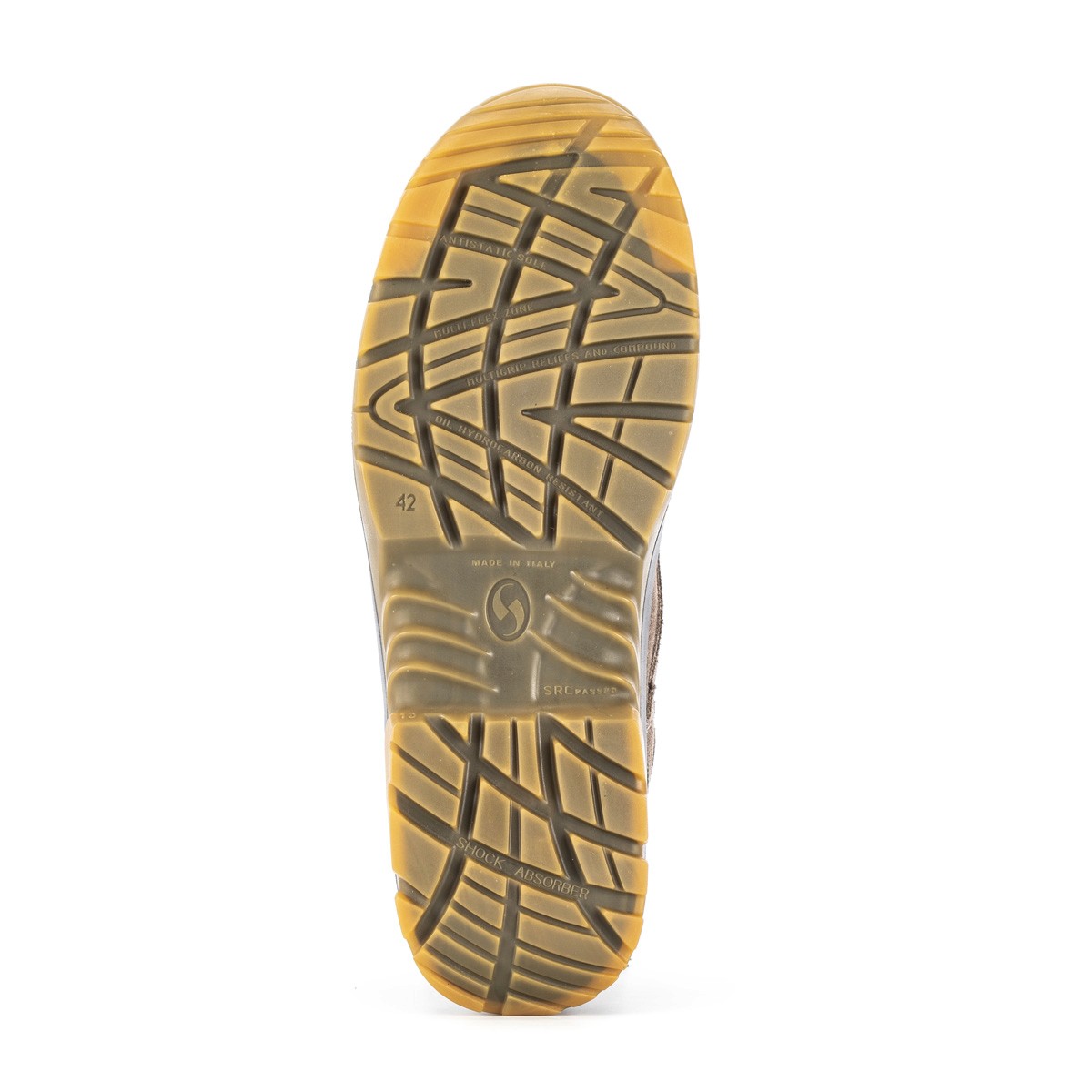 Two-component PU sole. Outsole suitable for indoor and outdoor use. Light and comfortable. Very flexible. Self-cleaning design and highly anti-slip. SRC Antislip Standard.